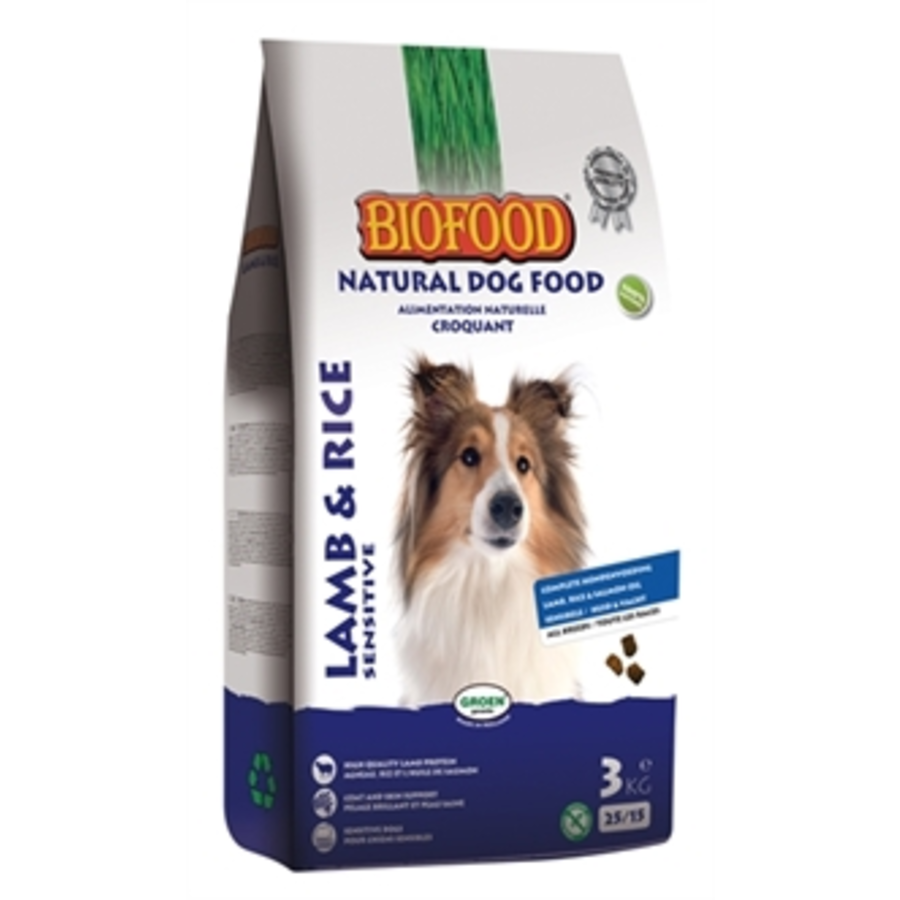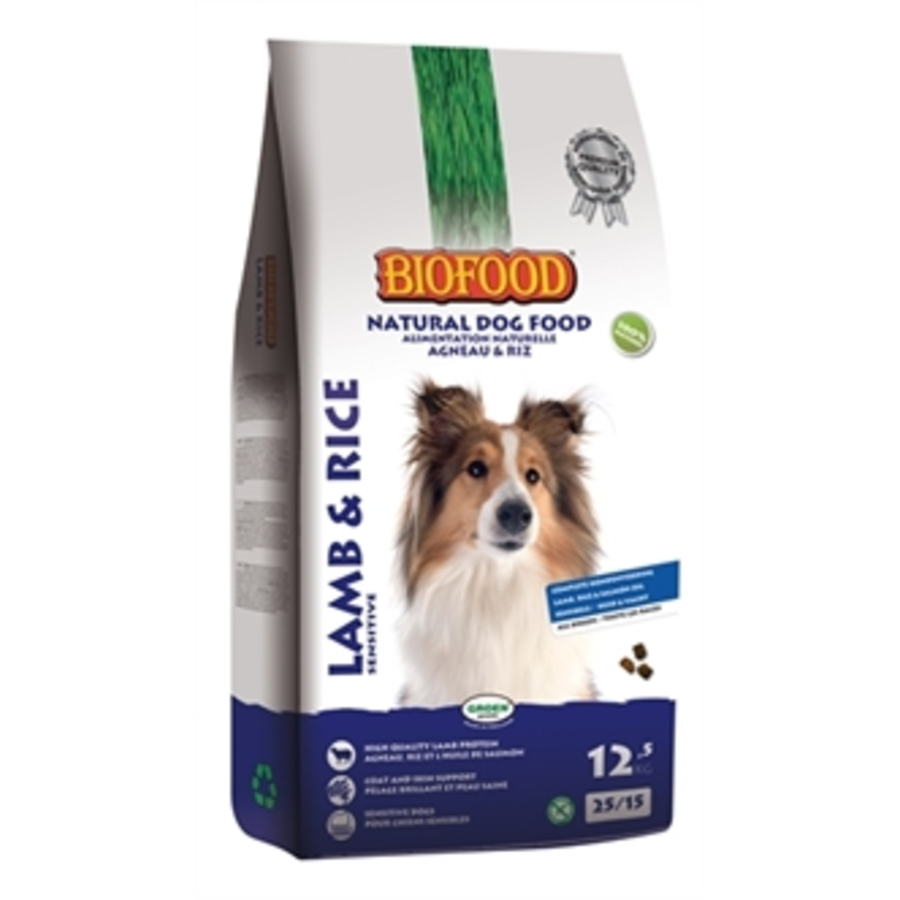 Biofood Lam/Rijst. Nederlandse topkwaliteit. Met hoogwaardige natuurlijke grondstoffen. Volledige licht verteerbare hondenvoeding voor volwassen honden. Met vers en gedroogd lam, zalmolie met essentiële omega 3 en 6 vetzuren, rijst, cranberry en glucosamine en chondroïtine.