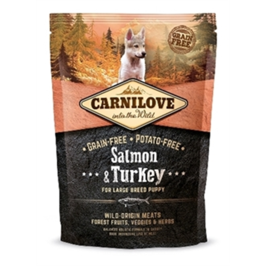 Carnilove Salmon / Turkey Puppies is graanvrij, kwalitatief hoogwaardig hondenvoer voor jonge honden van grote rassen met zalm en kalkoen, aansluitend bij de natuurlijke voedingsbehoefte van de hond. Deze puppybrokken zijn geheel vrij van aardappel en graan, omdat deze ook niet in het natuurlijke dieet van de wilde hond en wolf voorkomen. In plaats daarvan is er gebruik gemaakt van ingrediénten die beter aansluiten bij de voedingsbehoefte van de pup, namelijk een hoog aandeel dierlijke ingrediënten gecombineerd met verse groenten, fruit, kruiden en mineralen.