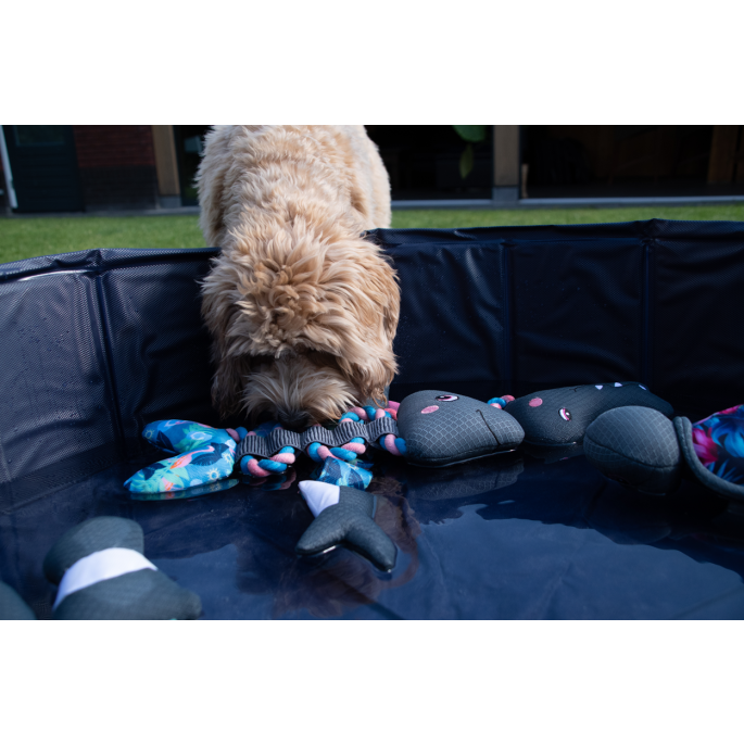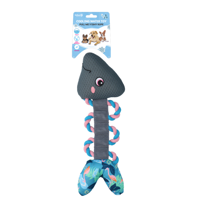 Pull Me! Fishy Rope is speciaal ontwikkeld voor de zomer. Het speeltje zorgt namelijk voor verkoeling, doordat het water opzuigt. Zodra de hond het speeltje in de bek neemt, komt het water eruit en voorkomt het dus uitdroging. Daarnaast blijft de vis ook drijven en kan het dus als apporteerspeeltje tijdens het zwemmen gebruikt worden. De beleving voor de hond is compleet dankzij de leuke pieper die in de vis verwerkt zit, de elastische veer voor tijdens trekspelletjes en het flosstouw, dat helpt bij het schoonmaken van het gebit van de hond!