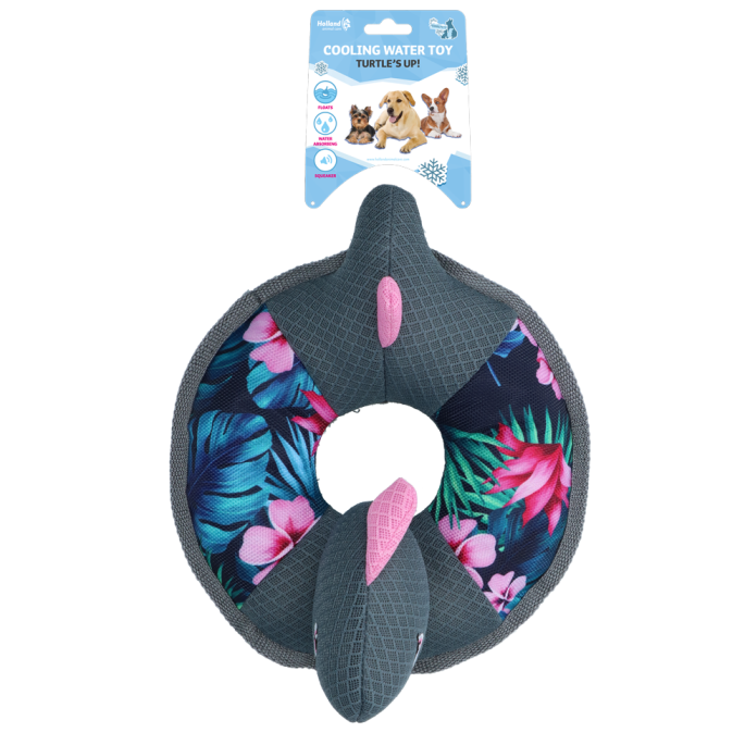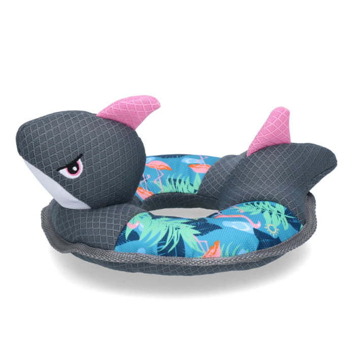 Voor deze haai hoef je niet bang te zijn! De stoere Ring O’Sharky is het perfecte hondenspeeltje voor in de zomer. Koel je trouwe viervoeter op speelse wijze door bijvoorbeeld met de haai te apporteren in het water; de haai blijft namelijk drijven! Ondertussen neemt het speeltje ook water op, wat vrij komt als de hond het in de bek neemt. Zo wordt uitdroging voorkomen en kun je samen met je hond onbekommerd blijven spelen. Dankzij het leuke kraakmateriaal en het piepje dat in de haai verwerkt zitten wordt het speelplezier bovendien extra groot!