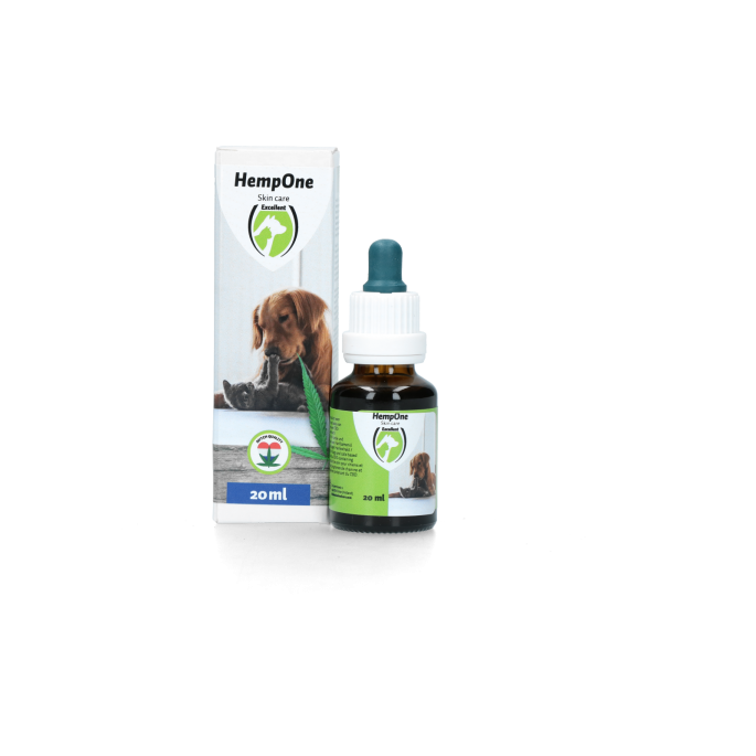 Huidverzorgingsproduct voor honden en katten op basis van hennepzaadolie en een hennepextract.