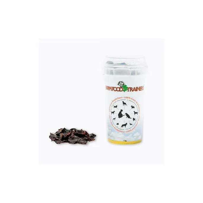 Farm Food Trainers Rund zijn kleine, harde, zeer smaakvolle stukjes luchtgedroogde hart van Runderen. U kunt gemakkelijk een aantal stukjes in een zakje in uw jas- of broekzak bewaren zonder dat ze kruimelen of plakkerig worden.