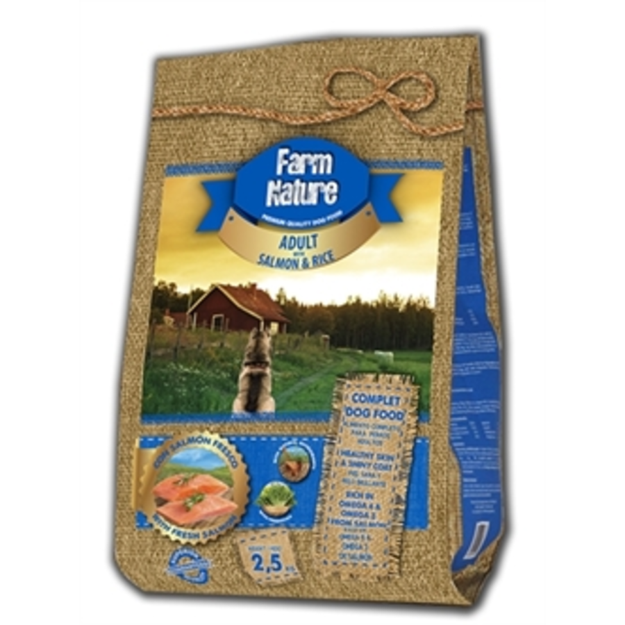 De omega-3 en omega-6 vetzuren zijn afkomstig uit hoge kwaliteitsproducten (kip en zalm). Deze voedingsstoffen zorgen voor een optimale conditie van de huid en vacht van uw hond. Farm nature salmon/rice is volledige diervoeding voor honden.