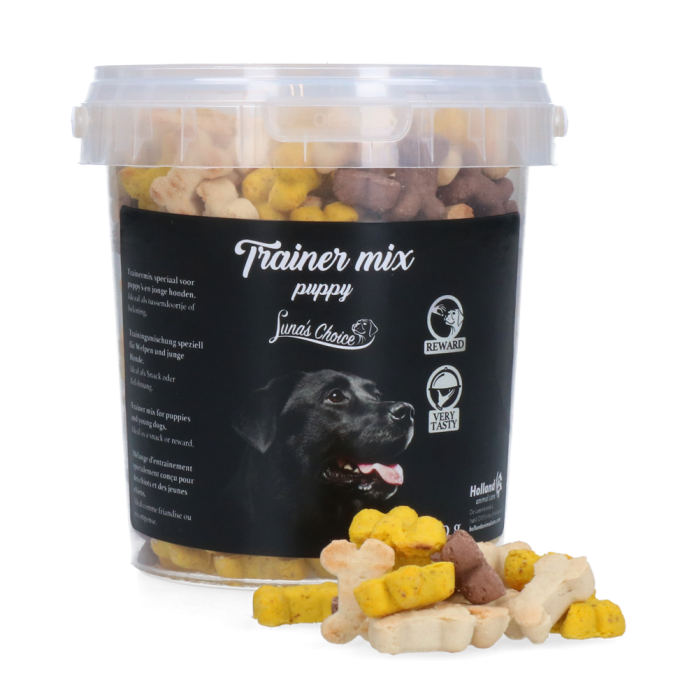 Deze koekjes zijn simpelweg de onweerstaanbare snack voor iedere hond. De koekjes worden met zorg gebakken in een oven en na het afkoelen en uitharden snel verpakt waardoor ze heerlijk vers en krokant zijn. Puppy mix staat voor het formaat, deze koekjes zijn namelijk maar 2 cm groot, waardoor ze perfect voor trainingen en cursussen gebruikt kunnen worden. Het mooiste van alles is dat deze snoepjes gemaakt zijn in Nederland!
