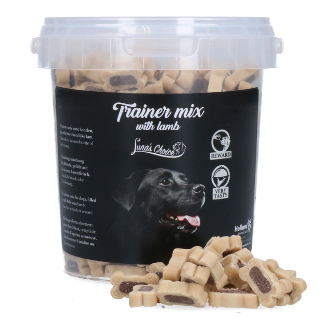 Deze trainer-snack is gevuld met heerlijk lamsvlees en is een semi-moist soft beloning. Dit houdt in dat deze snacks nog licht vochtig zijn en daardoor extreem krachtig zijn in smaak en geur. Daarom zijn dit ook de ideale snacks voor hondentrainers en baasjes om hun honden en pups te belonen bij goed gedrag tijdens een training of cursus. Deze trainer-snack bevat geen toegevoegde suikers en het mooiste van alles is dat deze snoepjes van Luna’s Choice gemaakt zijn in Nederland! Verpakt in een handig hersluitbare emmertje.Â