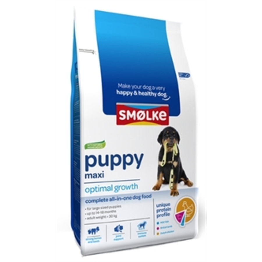 Smølke Puppy Maxi is een volledige en uitgebalanceerde voeding voor puppy’s van grote rassen tot de leeftijd van 18 maanden. Voor puppy’s van grote hondenrassen is het belangrijk dat ze niet te snel groeien. Daarom bevat de Smølke Puppy Maxi een aangepast energieniveau wat ervoor zorgt dat u hond de energie krijgt die hij nodig heeft voor een gelijkmatige groei. Daarnaast bevat deze voeding extra beta-glucanen om het kwetsbare immuun systeem optimaal te ondersteunen. Een ideale fosfor/calcium verhouding helpen uw pup de ontwikkeling van een sterk en gezond skelet en gebit. Daarnaast wordt de grote groei van het skelet ondersteund door de toevoeging van Glucosamine en Chondroïtine.