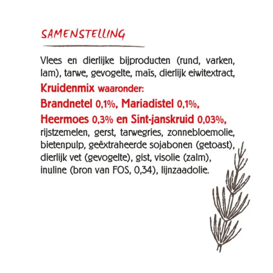 De 100% natuurlijke voeding bevat geen geur-, kleur-, smaakstoffen of conserveringsmiddelen. Ook zijn er geen suikers of zouten toegevoegd. Met name de kruiden en vitamine E zorgen voor een prima houdbaarheid.