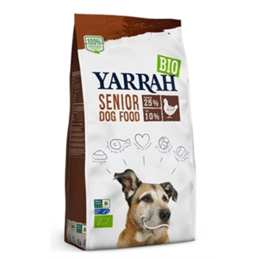 Yarrah Dog Biologische Brokken Senior 10 kg is volledig voer voor de oudere hond uit kip, vis, duivelsklauw, heermoes en rozenbottel, biologisch, proefdiervrij en duurzaam, zonder chemische toevoegingen en in recyclebare verpakking.